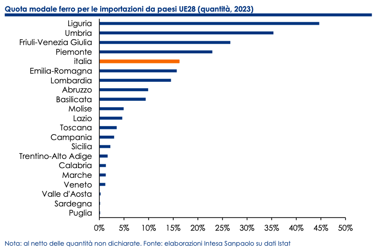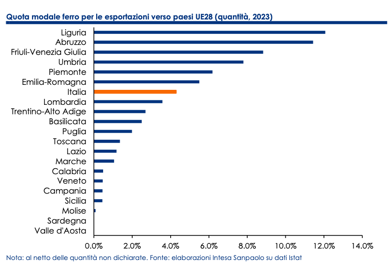 Un rapporto di Intesa Sanpaolo analizza le modalità di trasporto nelle regioni italiane: il ferroviario più vivace solo in Liguria, Umbria e Friuli-Venezia Giulia, per il resto la gomma conquista terreno un po’ ovunque, ma soprattutto al Sud e nelle filiere a più alto valore come l’abbigliamento e la pelletteria in Veneto e Toscana. A sorpresa il 42% dell’agroalimentare importato dall’Ue sceglie il treno