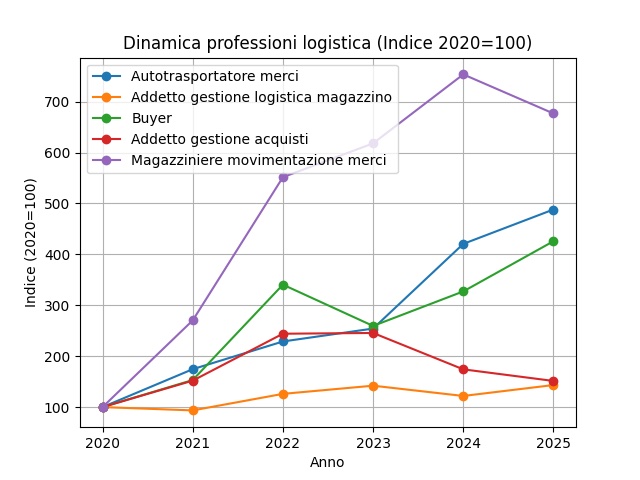 La richiesta di direttori della logistica, che nel 2020 era stata di appena 60 professionisti, nel 2025 arriva a 200 manager. I responsabili dell’organizzazione dei trasporti, ovvero chi per mestiere ottimizza e fluidifica le rotte, sono raddoppiati: da poco più di mille nel 2021 (non sono disponibili i dati per il 2020) a 2.240 nel 2025. Ma forse è l’impennata dei buyer che ci deve far riflettere ulteriormente.