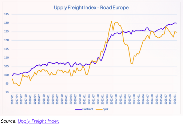 La previsione nell’outlook 2026 di Upply, la piattaforma di marketplace digitale nata in Francia e oggi attiva in molti paesi europei. Secondo lo studio le tariffe di trasporto su gomma rimarranno stabili su livelli alti in molti mercati, tra cui Germania, Francia, Spagna e Paesi Bassi dove la domanda di servizi aumenterà più del 2%. Le tensioni geopolitiche, costi in salita, difficoltà operative dovute alla carenza di manodopera abbassano la marginalità delle imprese che non possono fare altro che trasferire gli aumenti sui clienti