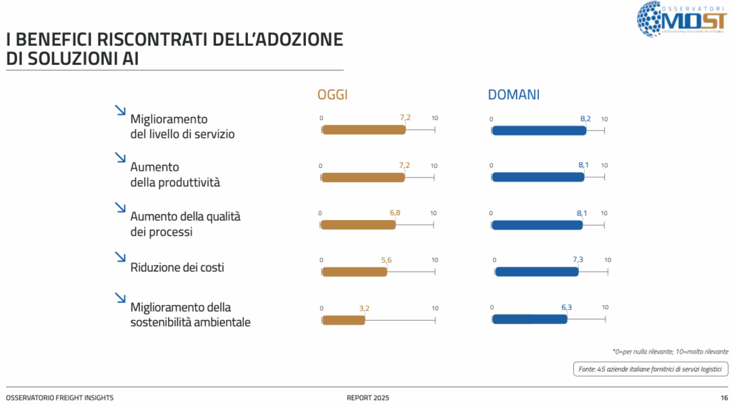 Nel cambiamento si cerca maggiore affidabilità, mentre l’ottimizzazione dei costi compare solo al secondo posto tra gli obiettivi delle aziende che acquistano servizi di trasporto. I vettori stanno rispondendo con l’introduzione dell’AI: il 18% dei fornitori ha già adottato soluzioni per il miglioramento del servizio e della produttività. Nel giro di tre anni la percentuale salirà al 40%