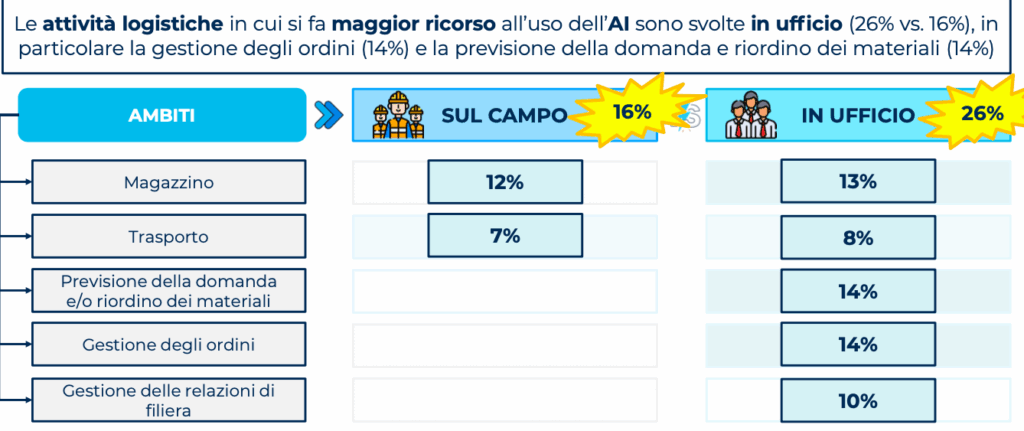 Anche autisti e magazzinieri coinvolti nei processi di trasformazione imposti dall’AI, ma i progetti che svilupperanno soluzioni per il lavoro sul campo si fermano al 16% tra quelli che le aziende adotteranno nel prossimo triennio. Tra cui l’identificazione smart dei veicoli, la comunicazione automatizzata tra azienda e mezzo, immagini che contano i colli ed eventuali danni. Tra le applicazioni da ufficio, la predizione dei tempi di attesa al carico e scarico, l’analisi delle scorte, pratiche doganali smart ed etichette intelligenti