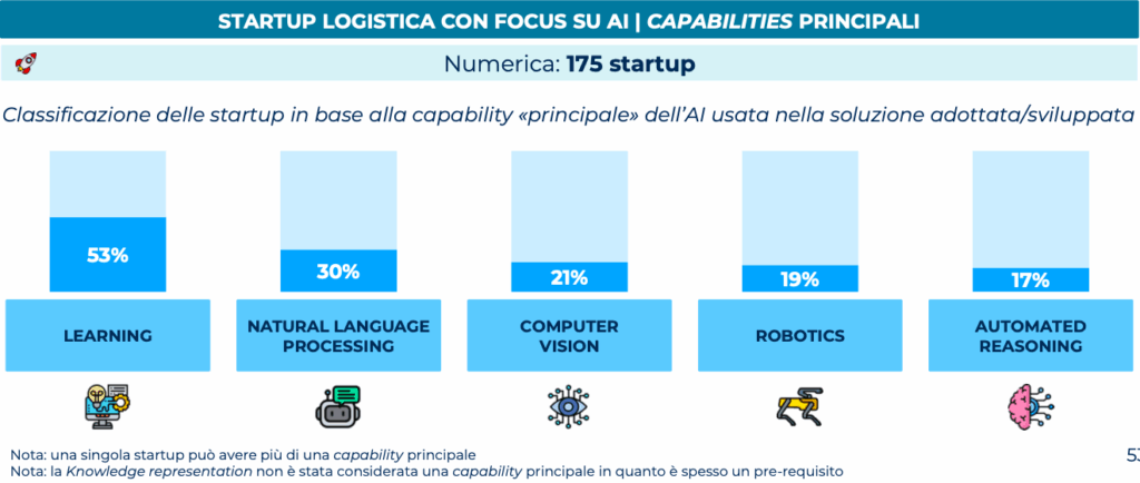 La ricerca sottolinea anche il grande interesse delle startup per le soluzioni legate alla logistica. Sono 175 le realtà contate dal Politecnico che stanno lavorando a progetti di intelligenza artificiale applicata alla logistica, il 53% di questi andranno a sviluppare il learning rispetto al processo, in altre parole soluzioni che agevolano la conoscenza dei dati in un sistema. Un’altra fetta importante di sperimentazione, che riguarda il 30% dei progetti, si basa sul Natural Language Processing, ovvero la capacità di comprendere e generare il linguaggio umano.