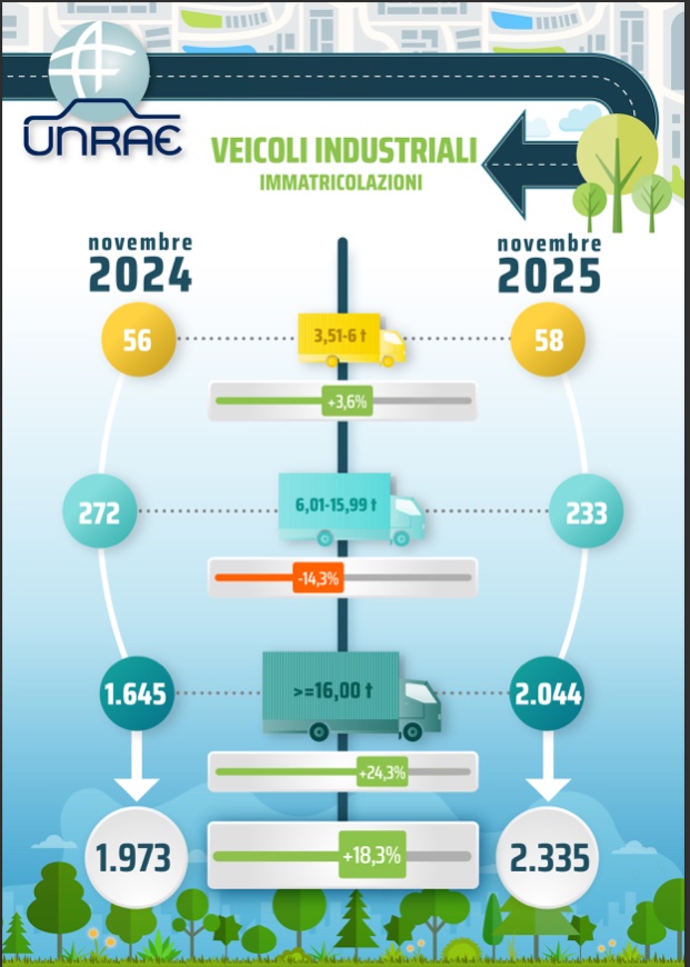 L’andamento dei singoli segmenti evidenzia dinamiche differenziate. I veicoli tra 3,51 e 6 t mostrano una lieve crescita del 3,6% (da 56 a 58 unità), mentre il segmento 6,01–15,99 t registra una contrazione del 14,3%, scendendo da 272 a 233 immatricolazioni. Decisamente positivo l’andamento dei mezzi pesanti con massa pari o superiore a 16 t, che avanzano del 24,3%, passando da 1.645 a 2.044 unità. All’interno del segmento, i carri crescono del 16,3% (da 731 a 850 unità) e i trattori stradali del 30,6% (da 914 a 1.194 unità). Nel cumulato gennaio–novembre 2025, il mercato dei veicoli oltre le 3,5 t totalizza 25.655 immatricolazioni, ancora in calo (-3,7%) rispetto alle 26.653 registrate nello stesso periodo del 2024.