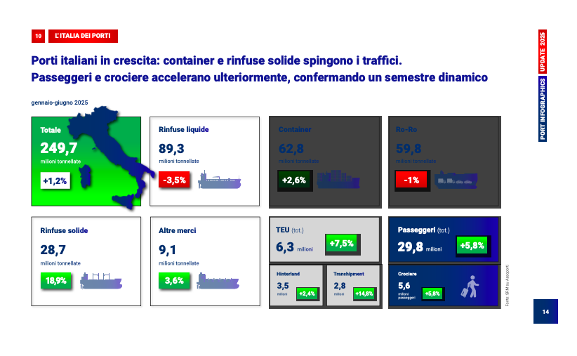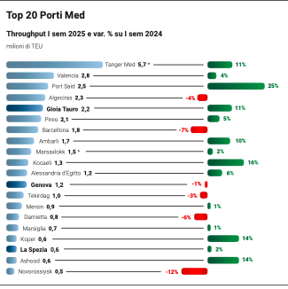 I porti italiani continuano a conquistare quote di mercato con i traffici che nel primo semestre 2025 crescono in media dell’1,2% con container in salita del 2,6% e le rinfuse solide in pieno boom con una crescita del 18,9%. L’Italia, a venti anni dall’avvio delle autostrade del mare, consolida la leadership nello short sea shipping arrivando a una quota di mercato del 41%, la più alta tra i paesi dell’aera mediterranea con quasi 260 milioni di tonnellate di merci spostate via mare.