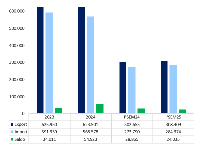 Il segno positivo del commercio estero italiano nel primo semestre del 2025 è sicuramente confortante, specie in relazione al risultato del 2024 che – ricordiamo – aveva registrato un andamento negativo (export -0,4%; import -3,9%).