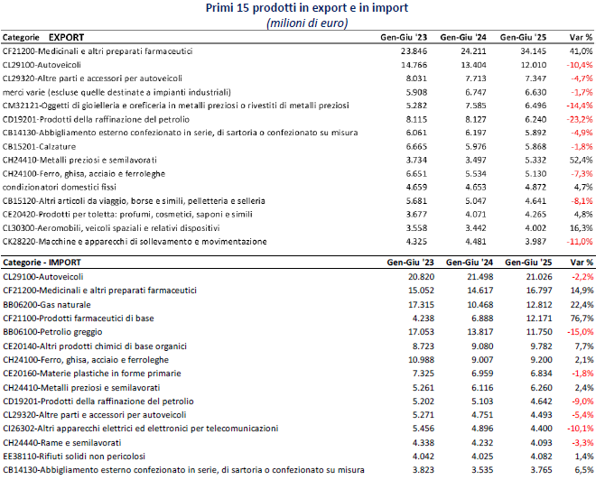 A livello nazionale le aree di prodotto che hanno subito maggiormente gli effetti della nuova politica daziaria statunitense, nel periodo gennaio-giugno, sono automotive (export italiano verso USA: -24,4%); altre industrie manifatturiere (gioielleria, strumenti musicali, ecc.; -15,8%) e metallurgia (-11,1%). Aumenta invece l’export per l’industria farmaceutica (+77,9%) ed altri mezzi di trasporto (navi, aerei, materiale rotabile ferroviario, ecc.; +12,4%). Situazione delicata infine per quanto riguarda i prodotti alimentari: è stata infatti avanzata l’ipotesi di applicare dazi aggiuntivi antidumping, pari al 91,74%, sulla pasta italiana esportata negli Stati Uniti, che si sommerebbero alla tariffa attuale del 15%, portando il dazio totale a circa il 107%.
