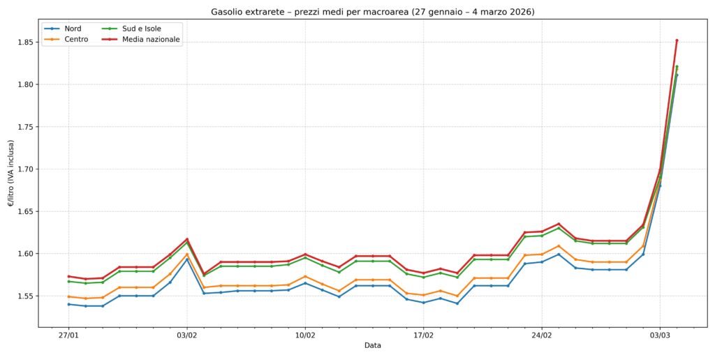 Il rialzo del costo gasolio extrarete dalla fine di gennaio è del 17,1%, ma circa l’80% degli aumenti si sono registrati da lunedì, il giorno di riapertura dei mercati dopo l’attacco Usa in Iran e lo scoppio della guerra in Medio Oriente. Il 27 gennaio un litro di gasolio veniva venduto nell’extrarete a 1,551 euro in media, ieri il prezzo era salito a 1,816 euro (Iva compreso).