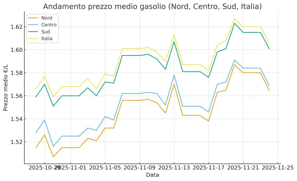 Il Sud e le Isole, tradizionalmente su livelli medi più elevati, hanno confermato la loro posizione: una fascia superiore stabile nei primi giorni, poi un progressivo rialzo che ha seguito il trend nazionale senza strappi, ma con un profilo sempre qualche centesimo sopra le altre macroaree. La media nazionale, frutto della ponderazione dei volumi di vendita, ha sintetizzato questa danza di piccoli movimenti con una linea ordinata e leggibile: un’Italia che parte da valori già in salita a fine ottobre e che, senza accelerazioni improvvise, scivola verso l’alto nella seconda metà del mese.