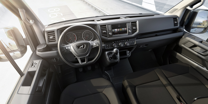 Numerosi gli scomparti per agevolare il lavoro quotidiano; imbottitura e profili dei sedili di guida, disponibili in quattro versioni, contribuiscono a rendere maggiormente confortevoli i lunghi tragitti, i rivestimenti resistenti e sperimentati nel mondo truck promettono una lunga durata.