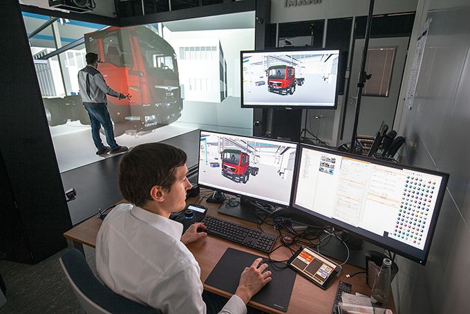 Prototipi virtuali in un laboratorio tridimensionale per individuare possibili errori prima dell’inizio della fase di produzione. È quanto accade nel centro di progettazione MAN Truck & Bus a Monaco, il “Cave Automatic Virtual Environment” (CAVE), dove i progettisti lavorano su cinque computer ad alte prestazioni che incorporano schede grafiche di ultima generazione, telecamere a infrarossi e proiettori stereo con risoluzione dell’immagine 2K per quattro schermi di grandi dimensioni.