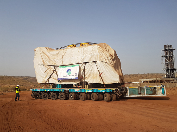 Quattro semoventi modulari Cometto MSPE 40ton in abbinamento laterale, sono stati utilizzati dalla Marine Maroc per effettuare un trasporto eccezionale consistente in sei motori diesel da 215t e sei generatori da 72ton per la centrale elettrica di Kaynes nel Mali. Un progetto gestito dalla Marine Maroc per conto del suo cliente Bolloré Logistics, incaricato dalla BWSC Denmark.