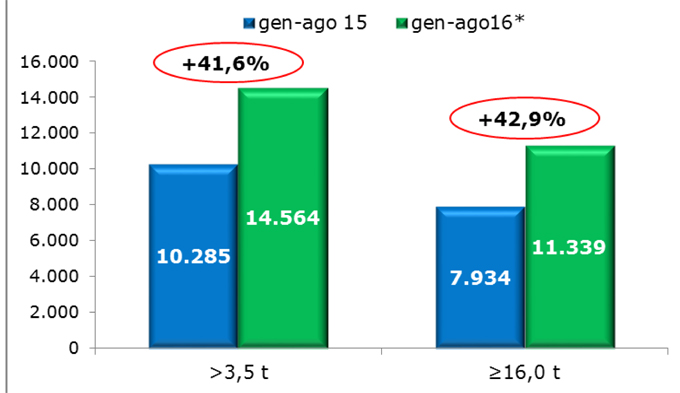 Il mercato dei veicoli con massa totale a terra sopra le 3,5 tonnellate nel luglio scorso è aumentato del 57,1% rispetto allo stesso mese del 2015 (2.490 veicoli contro i 1.585), mentre nel mese di agosto 2016 l’incremento è stato anche maggiore, pari al 63,3% rispetto all’agosto dell’anno scorso (1.380 veicoli contro i 845). Il cumulato dei primi 8 mesi incassa così una corposa crescita del 41,6% con 14.564 immatricolazioni totali che si confrontano con le 10.285 del gennaio-agosto 2015.