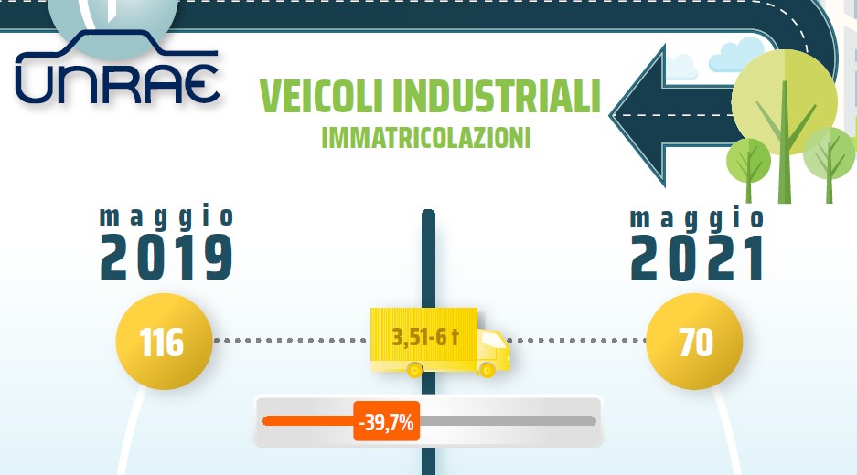 L’economia riprende a correre, eppure le immatricolazioni dei veicoli industriali – che dell’andamento economico dovrebbero essere lo specchio – continuano a frenare. Stando ai dati – diffusi dal ministero delle Infrastrutture ed elaborati dal Centro Studi Unrae – relativi ai veicoli con massa superiore alle 3,5 tonnellate, a maggio di quest’anno la flessione è stata del 15%, rispetto allo stesso mese del 2019. In termini assoluti, parliamo di 2.060 unità immatricolate a fronte delle 2.423 immatricolate nel 2019. Insomma, 363 veicoli industriali in meno. Se, invece, si guarda l’andamento da inizio 2021 il trend vede una crescita in positivo del 5,5% delle immatricolazioni rispetto allo stesso periodo del 2019.