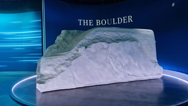 Il blocco, lungo oltre sei metri, alto quasi tre, è stato scolpito da un unico pezzo di materiale, e nelle sue superfici grezze cominciano ad affiorare le linee del prossimo van Mercedes-Benz. Come una forma che emerge lentamente dalla roccia, The Boulder è insieme metafora e promessa: la concretezza della tradizione che incontra la fluidità del futuro.