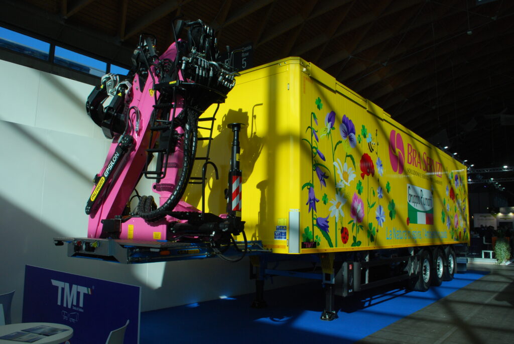 In fiera era presentato il nuovo trailer per BRA Servizi, con la partecipazione tecnica di GFM Oleodinamica. Il Conchiglia Moving Floor E110, pensato per il trasporto di rifiuti e materiali voluminosi, è equipaggiato anche con una gru Epsilon Palfinger M110Z77: «non l’avevamo a listino e l’abbiamo montata su un nostro piano mobile per la prima volta in questa occasione», aggiunge Spinozzi.