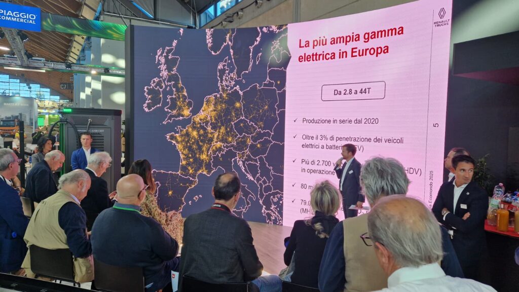 Bonaveglio ha poi ricordato come Renault Trucks produca camion elettrici di serie dal 2008 e oggi conta quasi 3.000 veicoli in circolazione in Europa, per un totale di 80 milioni di chilometri percorsi. In particolare, oggi in Europa circolano circa 12.000 camion medio-pesanti elettrici, concentrati soprattutto in Germania, Francia e Olanda. In Italia i veicoli Renault Trucks a zero emissioni sono 119, impiegati soprattutto nella raccolta rifiuti (24%), distribuzione urbana (47%) e trasporto refrigerato (11%). «Questa esperienza ci ha permesso di accumulare una base dati preziosa – ha spiegato – utile non solo per assistere i clienti, ma per progettare meglio i veicoli del futuro». Un know-how che si traduce in oltre 79 tonnellate di CO₂ risparmiate e in una crescita progressiva della quota di elettrico sul mix produttivo dell’azienda, oggi al 3% contro il 2% medio del mercato.