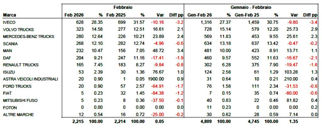 A febbraio gli scatti più evidenti sono quelli di Isuzu (+76,67%) e MAN (+48,72%), che mettono a segno le crescite percentuali più marcate. Ottima anche la prova di Mercedes-Benz e Volvo, che continuano a guadagnare terreno.