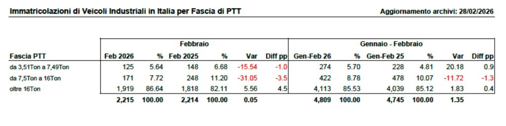 Il rallentamento attraversa tutte le categorie di peso. I medi (7,5-16 tonnellate) scivolano del 31,05%, i pesanti oltre 16 tonnellate cedono il 14,74%, mentre anche i leggeri arretrano del 15,54% dopo il balzo registrato a gennaio.