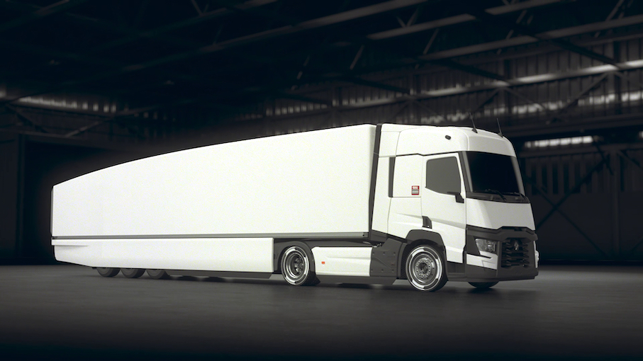L’aerodinamica del convoglio verrà ottimizzata, in particolare attraverso l’implementazione di un rimorchio a geometria variabile. Il rimorchio «adattativo», sviluppato da Fruehauf in collaborazione con Styl’Monde, dovrebbe assumere automaticamente una forma ottimizzata sfruttando lo spazio libero di carico, grazie a un sistema integrato di controllo-comando e di sensori. Anche l’aerodinamica della motrice verrà migliorata con la sostituzione dei retrovisori con videocamere e un nuovo design del primo montante della cabina (oggetto di una tesi di dottorato condotta dal Laboratorio di meccanica dei fluidi e di acustica della Scuola Centrale di Lione). Interventi anche sul flusso d’aria con l’estensione della parte anteriore e della parte bassa delle portee con il miglioramento degli archi delle ruote. Infine, le carenature laterali saranno allargate e realizzate con un materiale flessibile (prodotto da Polyrim), così come l’estensione dei deflettori laterali che creeranno continuità tra trattore e semirimorchio.