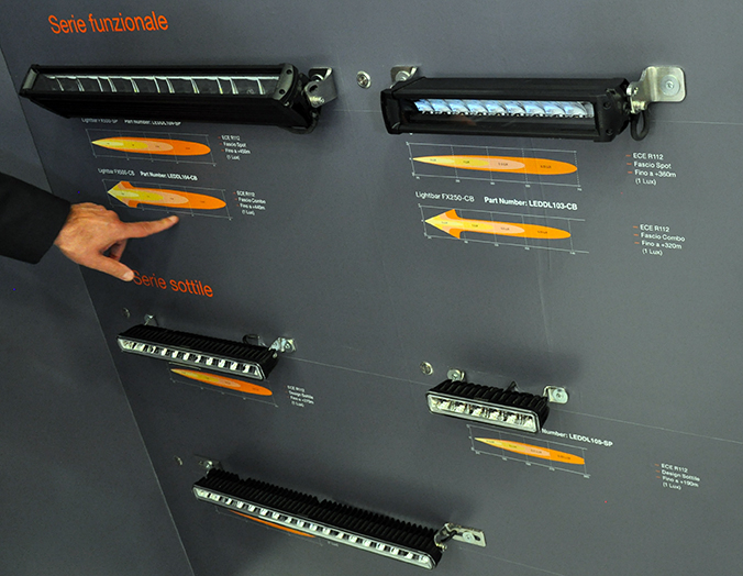 Tra i prodotti per camion e commerciali esposti si segnalano gli abbaglianti addizionali LEDriving. Si tratta di proiettori omologati che rilasciano fasci di luce molto intensa sulle superfici estese, con vantaggi in termini di flusso luminoso, visibilità e sicurezza. Ad esempio uno di questi prodotti fornisce 1 LUX di luce a 450 m, che vuol dire che a quella distanza dal veicolo c’è luminosità sufficiente per leggere un libro.