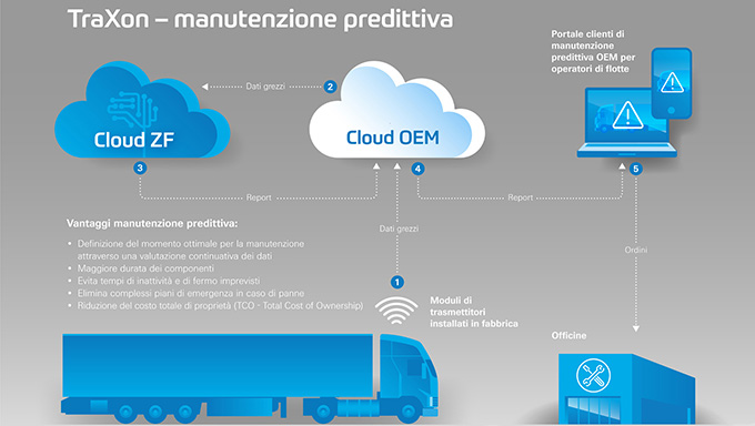 Per la funzione predittiva ZF utilizza moduli di trasmissione già integrati nel veicolo che trasmettono informazioni sullo stato della trasmissione al cloud del produttore dei componenti originali (OEM) del mezzo. La piattaforma dati dell’OEM è in contatto a sua volta con il cloud ZF, che può perciò utilizzare i dati primari ricevuti per compilare relazioni dettagliate sullo stato dei componenti della trasmissione. Queste vengono lette dall’OEM oppure dall’operatore di flotte e possono essere usate per pianificare proattivamente gli interventi di manutenzione. La sostituzione o riparazione tempestiva dei componenti interessati potrà così evitare inutili e costosi guasti.
