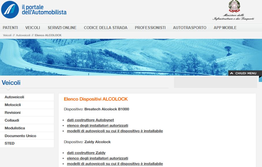 La pagina dedicata agli alcolock contiene, per ora, un elenco ancora limitato ma già operativo. Attualmente sono indicati due dispositivi: