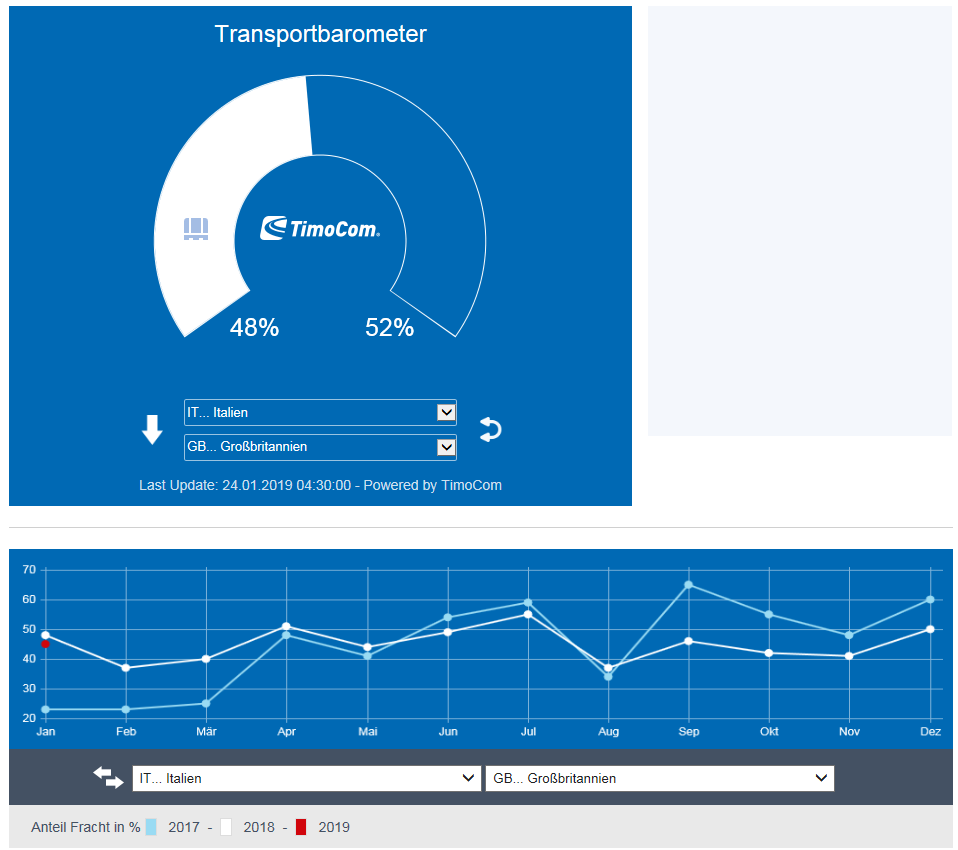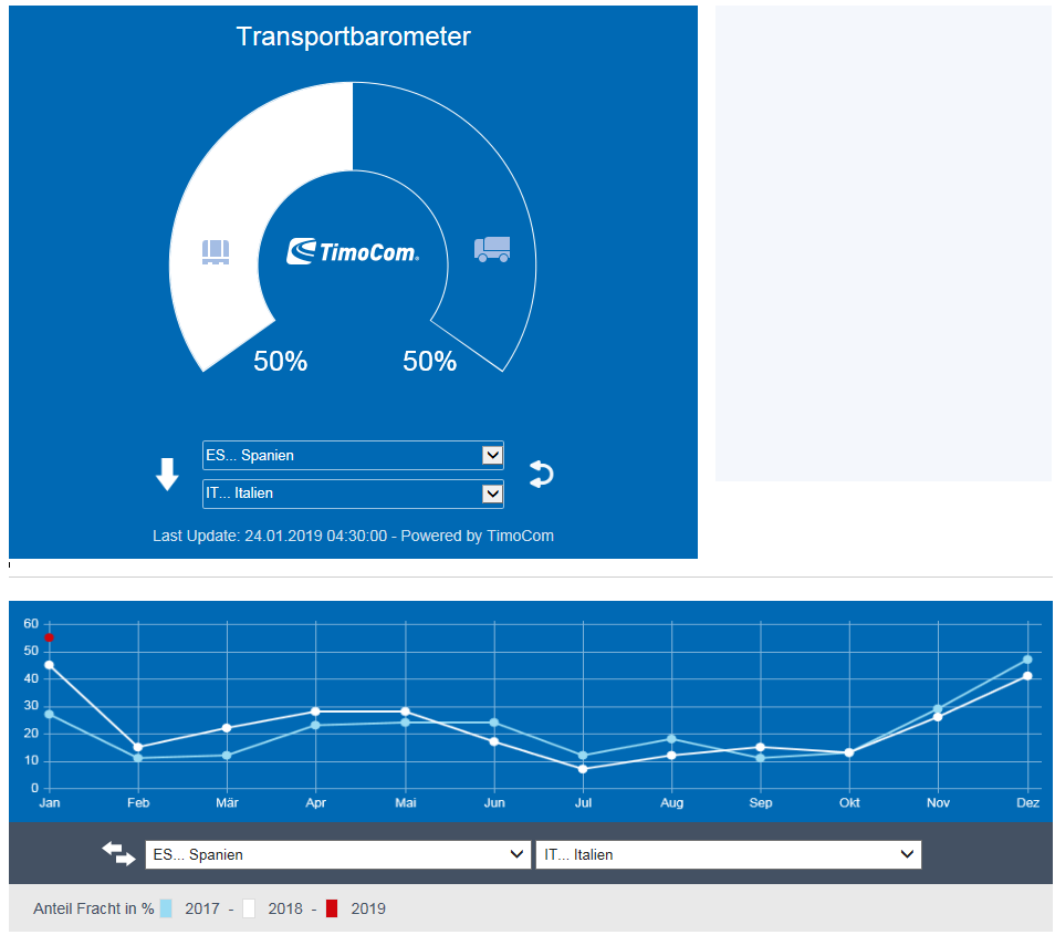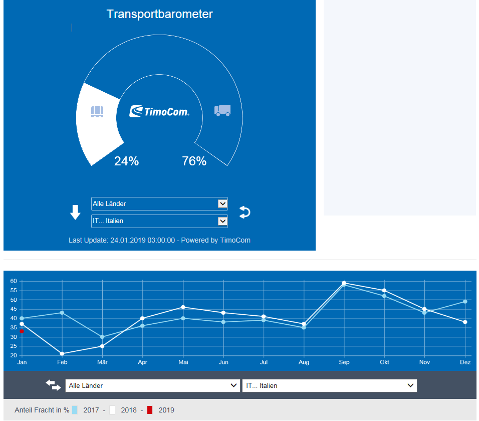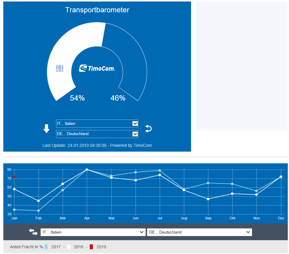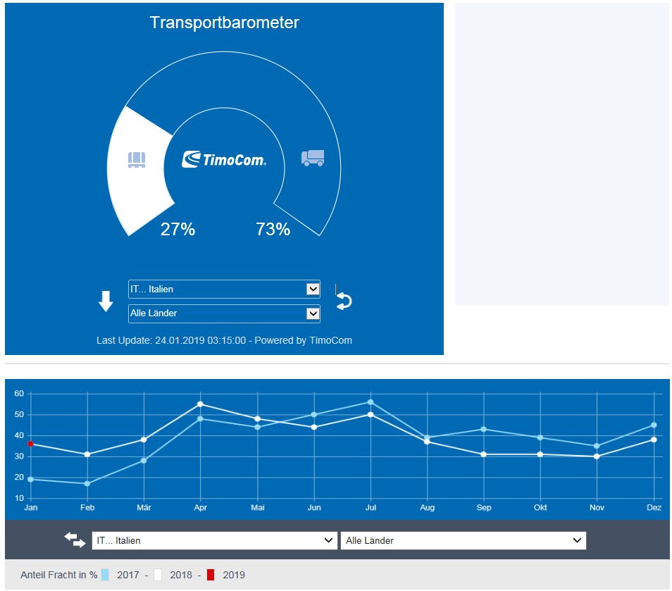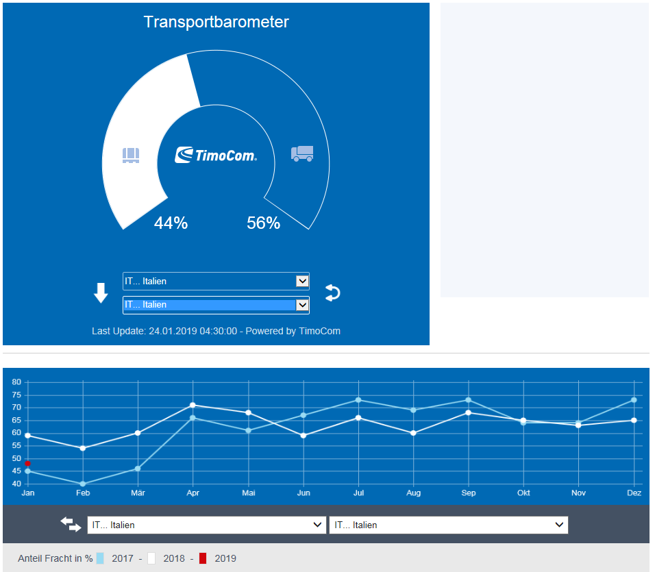 A essere generosi il 2018 verrà ricordata come un’annata mediocre per il mercato dei trasporti italiano. Due sole volte durante l’anno è stato raggiunto o superato il 50% nel rapporto carichi-mezzi (aprile 55% e luglio 50%), mentre nei restanti mesi l’indice ha quasi sempre oscillato tra il 30 e il 40%, un quadro confermato anche dall’ultimo trimestre. Sulla base dei dati forniti dal Barometro Trasporti di Timocom, si può vedere come il rapporto carichi:mezzi sia sempre stato di segno negativo: a ottobre e novembre 30:70 e a dicembre 38:62, col solito apporto ascensionale delle festività natalizie. Purtroppo il dato di gennaio 2019 è peggiorativo, con un rapporto carichi-mezzi del 27%. Insomma, c’è poca trippa per gatti.