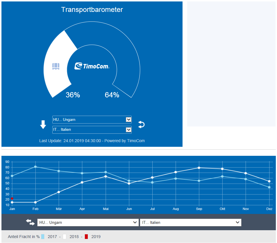 Poche soddisfazioni anche nelle relazioni con gli altri Paesi. Ad oggi, la quota carichi più alta è quella con la Francia (61:39), seguita da un apprezzabile 54:46 della Germania e da un per certi versi sorprendente 48:52 della Gran Bretagna. Il resto è poca cosa. Peggio ancora il mercato in entrata che vede un po’ di movimento di carichi dall’estero solo con il pareggio della Spagna (50:50) e in parte col traffico dall’Ungheria (36:64). Buone notizie invece dal mercato interno che, tra ottobre e dicembre 2018, si è mantenuto nel range 63-65%. Ma poi a gennaio 2019 la situazione si è normalizzata al ribasso, con un 44% indice di stagnazione.