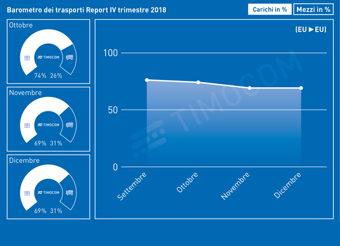 Se poi raffrontiamo la situazione con l’ultimo trimestre 2018 del resto d’Europa, viene fuori il solito gap col Continente, che chiude l’anno in bellezza, con una domanda di spazi di carico che si mantiene elevata. A ottobre nella UE era stato registrato un picco del 74% di carichi in rapporto al 26% di mezzi di trasporto, seguito da un 69% sia a novembre che a dicembre. Nessuna novità, peraltro: in genere il trend positivo europeo corrisponde a una tendenza negativa in Italia e viceversa.