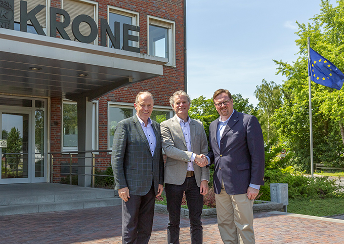 In foto: Peter Joosten, Managing Director Knapen Trailers B.V. (al centro) con Bernard Krone (a destra), Managing Director and Owner Krone Holding SE & Co. KG e Alfons Veer, Managing board Krone Holding SE & Co. KG.