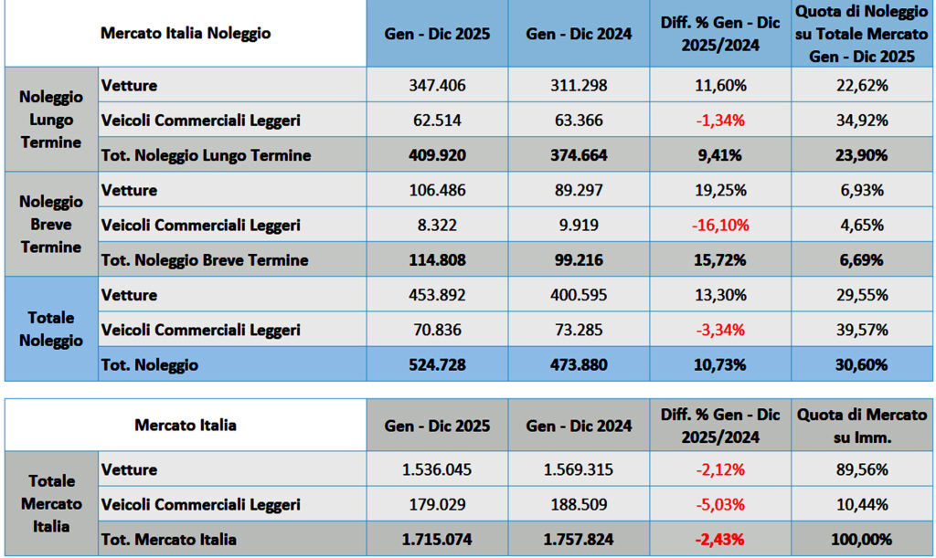 Secondo l’analisi ANIASA–Dataforce sulle immatricolazioni da gennaio a dicembre 2025, il noleggio ha rappresentato il 39,57% del mercato dei veicoli commerciali leggeri. In altre parole, quasi quattro mezzi da lavoro su dieci immatricolati in Italia sono entrati in flotta attraverso formule di noleggio, a breve o a lungo termine.