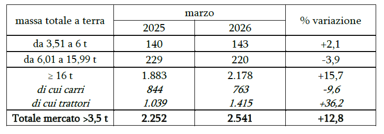 Il mercato dei veicoli industriali torna a correre a marzo, segnando un +12,8% su base annua. Secondo le stime del Centro Studi e Statistiche di Unrae, elaborate sui dati del Ministero delle Infrastrutture e dei Trasporti, le immatricolazioni sopra le 3,5 tonnellate hanno raggiunto quota 2.541 unità, contro le 2.252 dello stesso mese del 2025.