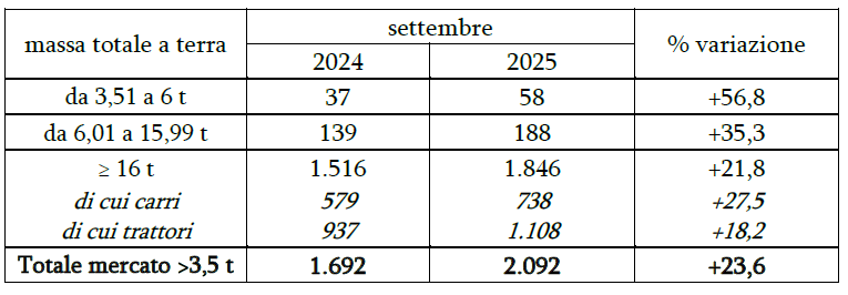 Il mercato dei veicoli industriali torna a respirare. Secondo i dati diffusi da Unrae, a settembre 2025 le immatricolazioni dei mezzi con massa complessiva superiore a 3,5 tonnellate sono aumentate del 23,6% rispetto allo stesso mese dell’anno precedente, raggiungendo quota 2.092 unità contro le 1.692 del 2024.