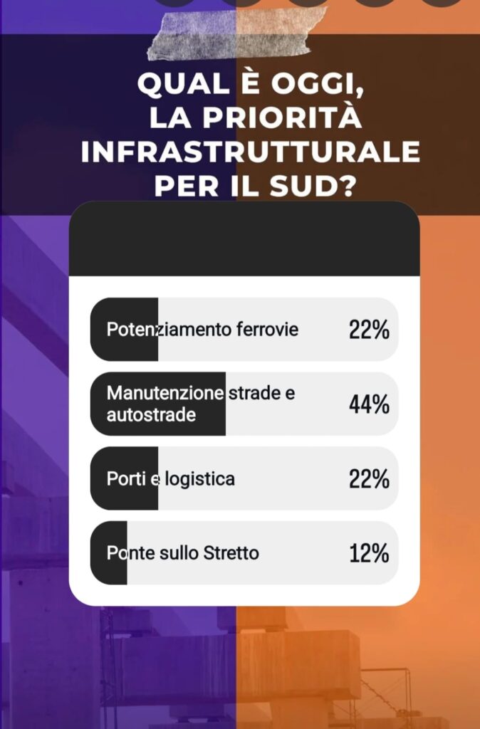 Quindi seppure il collegamento tra la Calabria e la Sicilia sarebbe utile all’autotrasporto e alla logistica, il 44% di chi ha risposto online ritiene che la priorità per il Sud sia la manutenzione delle strade e autostrade esistenti, il 22% ritiene che sia utile un potenziamento della reta ferroviaria e un altro 22% indica la logistica portuale in cima all’agenda e solo il 12% crede che il Ponte sia la reale priorità per il Sud.