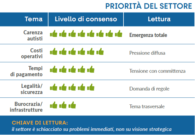 La carenza di autisti è indicata trasversalmente come la principale emergenza, insieme alla crescita dei costi operativi e alla difficoltà nei rapporti con la committenza, soprattutto sul fronte dei tempi di pagamento.