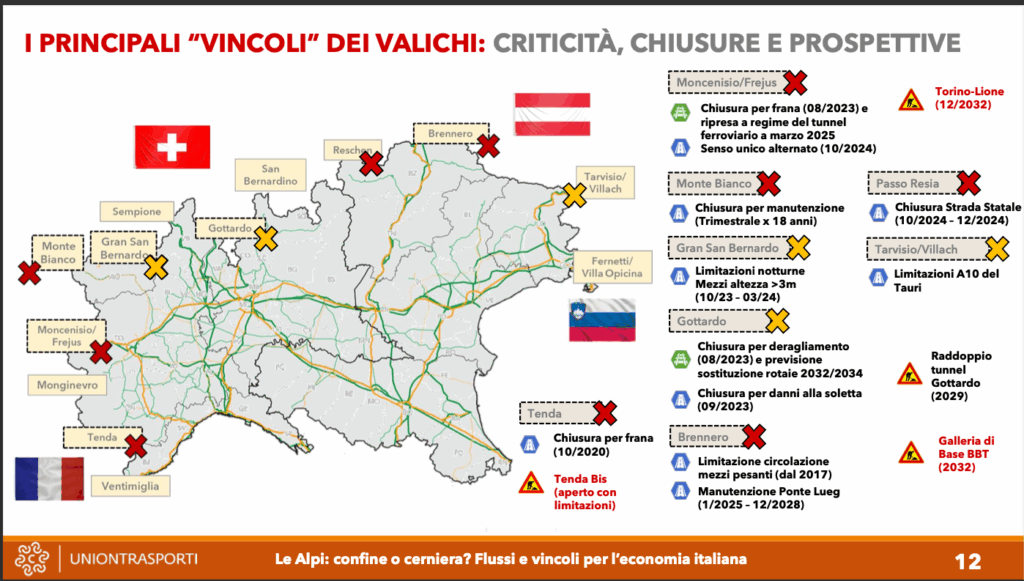 Le Alpi come vera e propria cerniera economica è l’immagine emersa dallo studio di Uniontrasporti presentato dal Direttore Antonello Fontanili. Nel 𝟐𝟎𝟐𝟒 l’𝐢𝐧𝐭𝐞𝐫𝐬𝐜𝐚𝐦𝐛𝐢𝐨 𝐜𝐨𝐦𝐦𝐞𝐫𝐜𝐢𝐚𝐥𝐞 𝐝𝐞𝐥𝐥’𝐈𝐭𝐚𝐥𝐢𝐚 𝐜𝐨𝐧 𝐢 𝐏𝐚𝐞𝐬𝐢 𝐝𝐞𝐥𝐥’𝐔𝐧𝐢𝐨𝐧𝐞 𝐞𝐮𝐫𝐨𝐩𝐞𝐚 𝐡𝐚 𝐬𝐮𝐩𝐞𝐫𝐚𝐭𝐨 𝐢 𝟔𝟕𝟎 𝐦𝐢𝐥𝐢𝐚𝐫𝐝𝐢 𝐝𝐢 𝐞𝐮𝐫𝐨(oltre 750 miliardi includendo Regno Unito e Svizzera). Di questo valore, 𝐜𝐢𝐫𝐜𝐚 𝟓𝟐𝟓 𝐦𝐢𝐥𝐢𝐚𝐫𝐝𝐢 𝐝𝐢 𝐞𝐮𝐫𝐨 – pari a più dell’𝟖𝟕% – è transitato 𝐚𝐭𝐭𝐫𝐚𝐯𝐞𝐫𝐬𝐨 𝐢 𝐯𝐚𝐥𝐢𝐜𝐡𝐢 𝐚𝐥𝐩𝐢𝐧𝐢, 𝐬𝐮 𝐬𝐭𝐫𝐚𝐝𝐚 𝐞 𝐟𝐞𝐫𝐫𝐨𝐯𝐢𝐚. “Garantire 𝐢𝐧𝐟𝐫𝐚𝐬𝐭𝐫𝐮𝐭𝐭𝐮𝐫𝐞 resilienti, interoperabili e sostenibili – ha detto Fontanili – significa rafforzare la 𝐜𝐨𝐦𝐩𝐞𝐭𝐢𝐭𝐢𝐯𝐢𝐭à del sistema produttivo e la connessione del Paese con l’𝐄𝐮𝐫𝐨𝐩𝐚.
