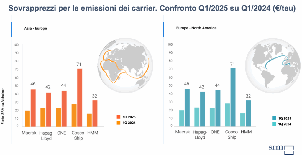 Nel corso del convegno, Alessandro Panaro, head Maritime& Energy del Centro Studi e Ricerche di Intesa Sanpaolo (SRM), ha riportato stime di 6 miliardi di impatto sul trasporto marittimo globale derivanti dalla piena applicazione dell’ETS, ma soprattutto ha evidenziato l’impatto crescente dei sovrapprezzi del trasporto marittimo dovuti all’applicazione della tassa.