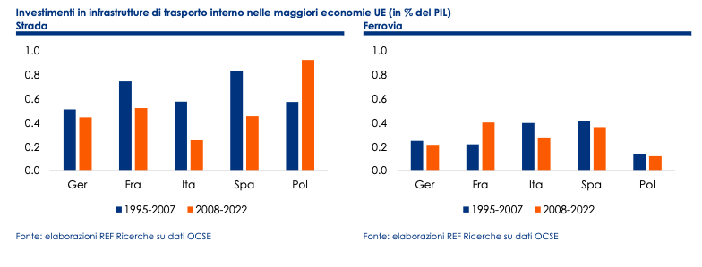 Ma soprattutto in questi anni l’Europa non ha investito risorse sufficienti nell’intermodalità. “Le risorse destinate al sistema dei trasporti sono state piuttosto limitate – si legge nel rapporto – soprattutto nel periodo successivo alla grande crisi finanziaria del 2008; inoltre, all’interno di queste, il trasporto stradale ha continuato ad assorbire una quota importante degli interventi, una tendenza che pare destinata a protrarsi anche alla luce delle esigenze di manutenzione del parco stradale europeo. Solo recentemente si è osservata un’accelerazione, soprattutto in Paesi come Spagna e Italia, anche a seguito delle risorse messe a disposizione dal Next Generation EU per finanziare i PNRR nazionali”. L’asfissia delle risorse è stata particolarmente pesante per i paesi che hanno fatto i conti con debiti pubblici importanti come Italia e Spagna che quindi hanno dovuto stringere molto i cordoni della borsa. Con buona pace dell’intermodalità.