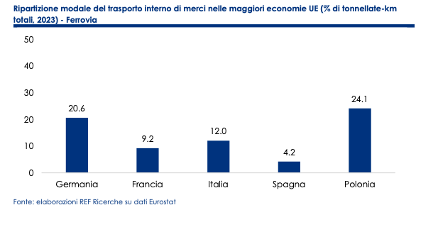 Le merci in Europa viaggiano ancora sostanzialmente sulla strada. La tanto acclamata interoperabilità rischia di rimanere sulla carta e nei buoni propositi dei dossier comunitari, incagliata in gap infrastrutturali, in cavilli regolatori e in ritardi tecnologici, ma soprattutto asfissiata dalla carenza di risorse e di investimenti. Negli ultimi 20 anni il cargo ferroviario nei Paesi Ue è arretrato passando da una media del 19% al 7% delle tonnellate di merci movimentate. A tutto beneficio della modalità stradale che invece è cresciuta anche sulle tratte più lunghe arrivando a una media Ue del 74%, che tocca e supera il 90% in paesi come la Spagna, la Francia e l’Italia. Tra le economie più importanti, solo Germania e Polonia hanno una quota di trasporto ferroviario rilevante, intorno al 20%, dovuta anche alla specializzazione industriale legata alle produzioni pesanti e non deperibili. È questa, in sintesi, la fotografia che emerge dal rapporto “Intermodalità e tendenze del trasporto merci in Europa” redatto da Laura Campanini, economista del Research Department Intesa Sanpaolo in collaborazione con REF Ricerche che Uomini e Trasporti ha potuto leggere. Lo studio parte dai target europei in fatto di intermodalità, con gli obiettivi fissati nel 2020 di aumentare entro il 2023 il trasporto ferroviario del 50% ed entro il 2050 di portarlo a un incremento del 100%, e analizza come sono andate le cose negli ultimi 20 anni.