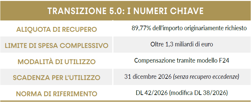Molte imprese erano rimaste escluse dal credito d’imposta Transizione 5.0 per esaurimento delle risorse disponibili. Il DL 38/2026 aveva previsto un recupero parziale del beneficio, limitato al 35% dell’importo richiesto. Il successivo DL 42/2026 interviene in modo molto più incisivo, elevando l’aliquota all’89,77% dell’importo originariamente richiesto, entro un limite di spesa superiore a 1,3 miliardi di euro.