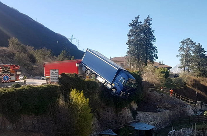 Incidente dagli esiti drammatici questa mattina nei pressi di Vezzano, in Valle dei Laghi. Un autotrasportatore di 57 anni, residente in provincia di Ferrara, è rimasto investito dal suo camion ed ha perso la vita. L’autista aveva fermato il mezzo nel piazzale del ristorante “Al Bersaglio”, poco sopra l’abitato, sulla statale della Gardesana. Il rimorchio, adibito al trasporto di legname, era staccato dalla motrice, ma durante le operazioni di aggancio qualcosa è andato storto – forse un guasto o il freno a mano non azionato – e il mezzo, in leggera discesa, ha cominciato a muoversi. Con la motrice che si avviava senza controllo verso il paese, l’autista avrebbe tentato di salire in cabina per fermarla, ma sarebbe stato trascinato in avanti e sbalzato con violenza al di sotto della strada per una decina di metri. L’autotreno ha poi proseguito nella sua corsa, scardinando il parapetto e finendo sospeso su una rupe.