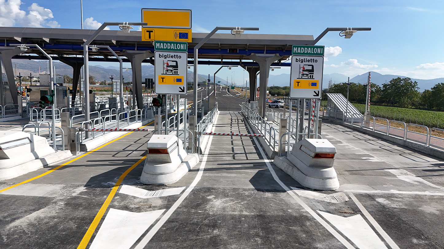 - Piazzale di esazione ampio e sicuro, con 5 piste in uscita e 3 in entrata, più varchi speciali per mezzi pesanti.
