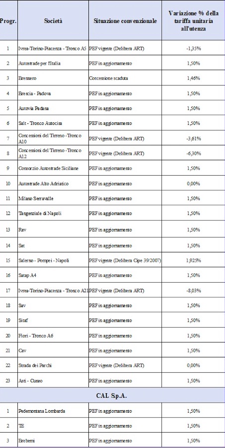 Contrariamente a quanto annunciato nei mesi scorsi, i pedaggi autostradali aumenteranno in media dell’1,5% dal prossimo 1° gennaio. L’annuncio è arrivato dal ministero delle Infrastrutture e dei Trasporti e, in particolare, dal vicepremier Matteo Salvini che in una nota ha espresso contrarietà e delusione per una decisione derivata da una determinazione dell’Art, l’Autorità per i trasporti, legittimata dalla pronuncia della Corte Costituzionale che sblocca gli aumenti legati al recupero dell’inflazione per tutte le società concessionarie autostradali per le quali è in corso la procedura di aggiornamento dei relativi Piani Economico – Finanziari. Per le società Concessioni del Tirreno (Tronco A10 e A12), Ivrea-Torino-Piacenza (Tronco A5 e A21) e Strada dei Parchi, in vigenza di periodo regolatorio, non sono previste variazioni tariffarie a carico dell’utenza, in linea con i rispettivi Atti convenzionali vigenti. Una variazione pari all’1,925% è riconosciuta alla concessionaria Salerno–Pompei–Napoli S.p.A. Infine, è riconosciuto un adeguamento tariffario pari all’1,46% per la società Autostrada del Brennero p.A., con concessione scaduta, per la quale è in corso il riaffidamento della medesima (nella tabella tutti gli aumenti).