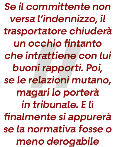Con i tempi di attesa accadrà la stessa cosa: se il committente non versa l’indennizzo, il trasportatore chiuderà un occhio fintanto che intrattiene con lui buoni rapporti. Poi, se le relazioni mutano e l’anno di prescrizione glielo consente, magari lo porterà in tribunale. E lì finalmente si appurerà se quella normativa fosse o meno derogabile. Per questo serve affiancare alla difesa giuridica una strategia diversa: innanzitutto, bisognerebbe rimettere a fuoco il committente, mitigandone i tratti che lo rappresentano come figura da cui difendersi, per ribadire un’affermazione scontata: senza di lui il settore non avrebbe ragione d’essere e ciò lo rende insostituibile. Quindi, fin quando l’autotrasportatore avrà timore di essere sostituibile per forza di cose resterà parte debole.